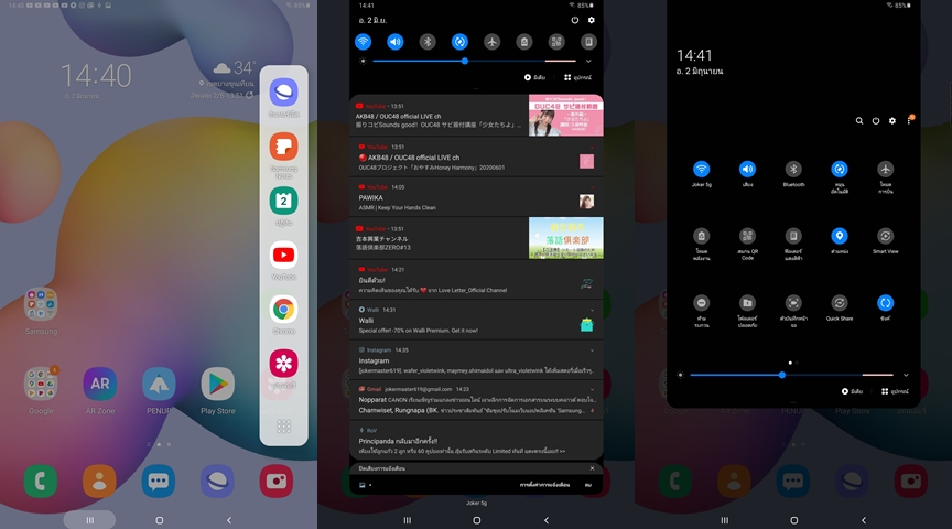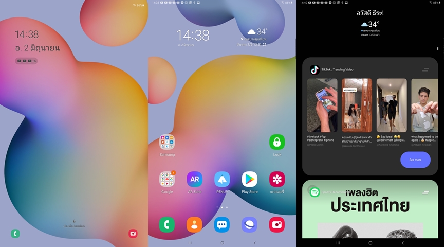 Samsung Galaxy Tab S6 Lite ทำงานบน Android 10 ครอบทับด้วย One UI 2.1 หน้าตาการใช้งานสวยงาม ความเร็วและความลื่นไหลอยู่ในระดับที่ดีครับ ไม่ได้ลื่นขนาดพวกเรือธง แต่ก็ไม่รู้สึกอืดหรือหน่วงอะไร มาพร้อม Dark Mode ช่วยถนอมสายตา หน้าซ้ายสุดจะเป็นในส่วนของ Bixby Home รวมข้อมูล แอปพลิเคชั่น และการแจ้งเตือนต่างๆ นอกจากนี้ยังเรียนรู้กิจวัตรประจำวันเพื่อปรับแต่งเนื้อหาให้เหมาะสมกับผู่ใช้ สำหรับรุ่นนี้จะไม่มีสแกนลายนิ้วมือนะครับ จะมีแต่สแกนใบหน้าเท่านั้น