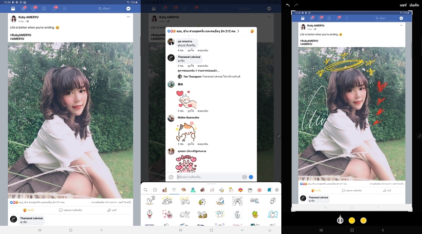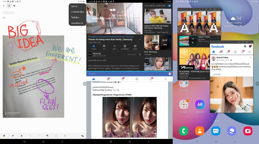S Pen รองรับแรงกด 4,096 ระดับ สำหรับรุ่นนี้ไม่ต้องชาร์จนะครับ มาพร้อมฟีเจอร์แปลงลายมือเป็นตัวพิมพ์ สามารถคัดลอก แก้ไข และส่งต่อได้ทันที รองรับทุกความต้องการ ไม่ว่าจะเป็นการวาดภาพ หรือจดบันทึก แก้ไขงานเอกสาร สามารถเขียนข้อความลงบนไฟล์ PDAF ได้โดยตรง (เมื่อผ่านแอปพลิเคชั่นบนเครื่อง) และรองรับ Multi Window (การแบ่งหน้าจอ) ระดับ Advanced ซึ่งนอกจากแบ่งหน้าจอแล้ว ยังสามารถแบ่งหน้าจอแบบ Pop-Up และไอค่อนบนหน้าจอได้อีกด่วยทำให้สามารถรับชมคลิปวีดีโอ ไปพร้อมกับการจดบันทึกได้ แถมยังสามารถปรับค่า Transparent เพื่อให้มองเห็นหน้าจออื่นๆ ได้ด้วย แถมสามารถสลับหน้าจอไปมาได้อย่างง่ายดายและลื่นไหล